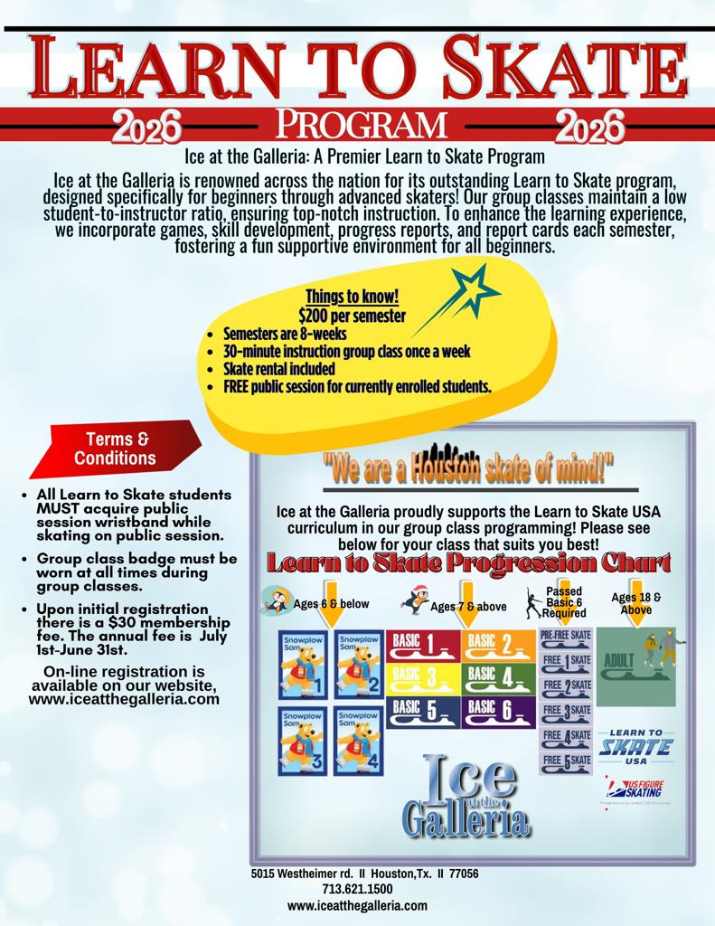 Ice at the Galleria's opened in 1972! This Houston iconic landmark is a rich part of the Houstonian community. We have 95 plus Learn to Skate classes per week, Ballet and Off Ice Training. We teach skaters from the age of 3 and above, from their first steps on the ice to the highest level of competition. We are the home of Olympic champion, Tara Lipinski as well as many other international competitors.
